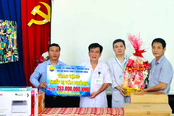 Sáng 16-1, Công ty TNHH MTV Xổ số kiến thiết Khánh Hòa đến thăm, chúc Tết và hỗ trợ 300 triệu đồng cho bếp ăn từ thiện tại Bệnh viện Đa khoa tỉnh, Bệnh viện Chuyên khoa Tâm thần tỉnh, Bệnh viện Bệnh nhiệt đới tỉnh; hỗ trợ Trung tâm Bảo trợ xã hội tỉnh 10 triệu đồng; tặng 10 bộ máy vi tính và máy in cho Bệnh viện Bệnh nhiệt đới tỉnh trị giá 253 triệu đồng. Tổng số tiền hỗ trợ cho các đơn vị 563 triệu đồng.