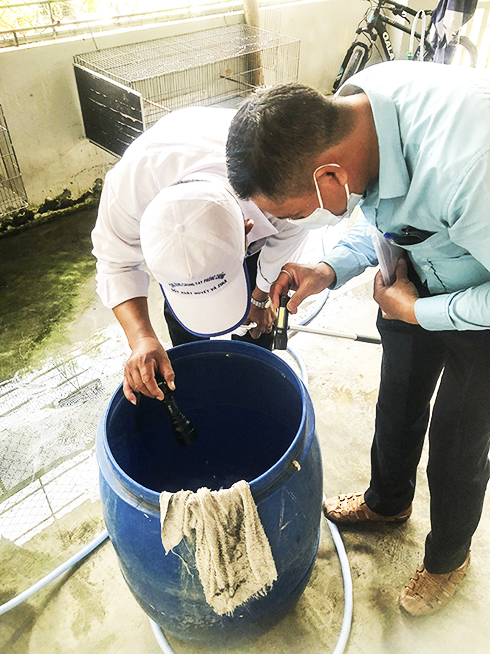 Cán bộ y tế Trung tâm Kiểm soát bệnh tật tỉnh kiểm tra dụng cụ chứa nước tại nhà một hộ dân ở TP. Nha Trang. |