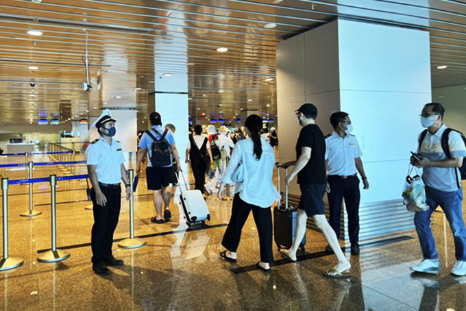 Kiểm dịch viên của Trung tâm Kiểm dịch y tế quốc tế phân luồng, giám sát sức khỏe hành khách ở Sân bay quốc tế Cam Ranh. |