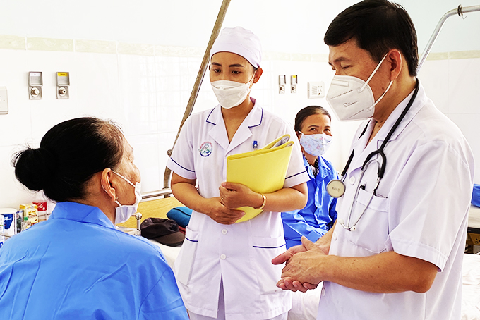 Bác sĩ Bệnh viện Ung bướu tỉnh trao đổi tình trạng bệnh với bệnh nhân điều trị nội trú. |